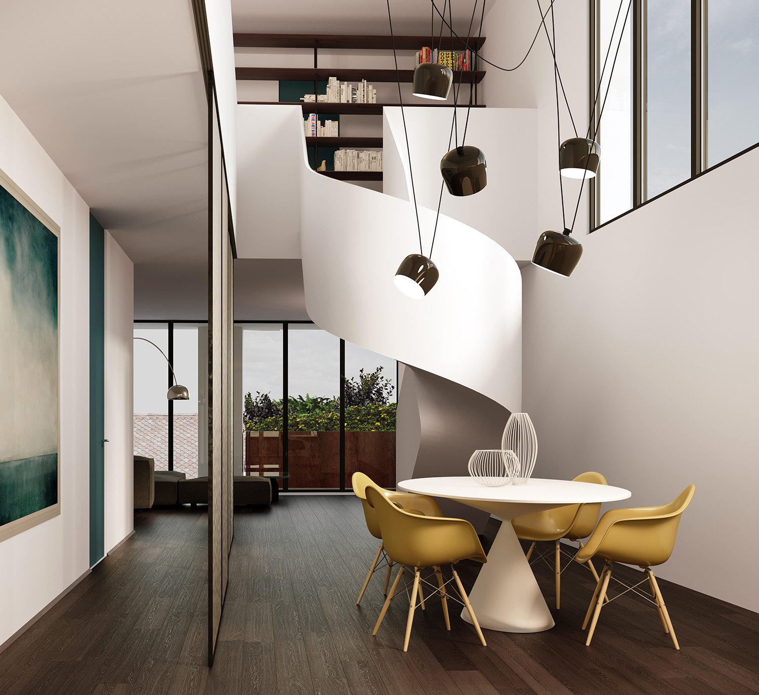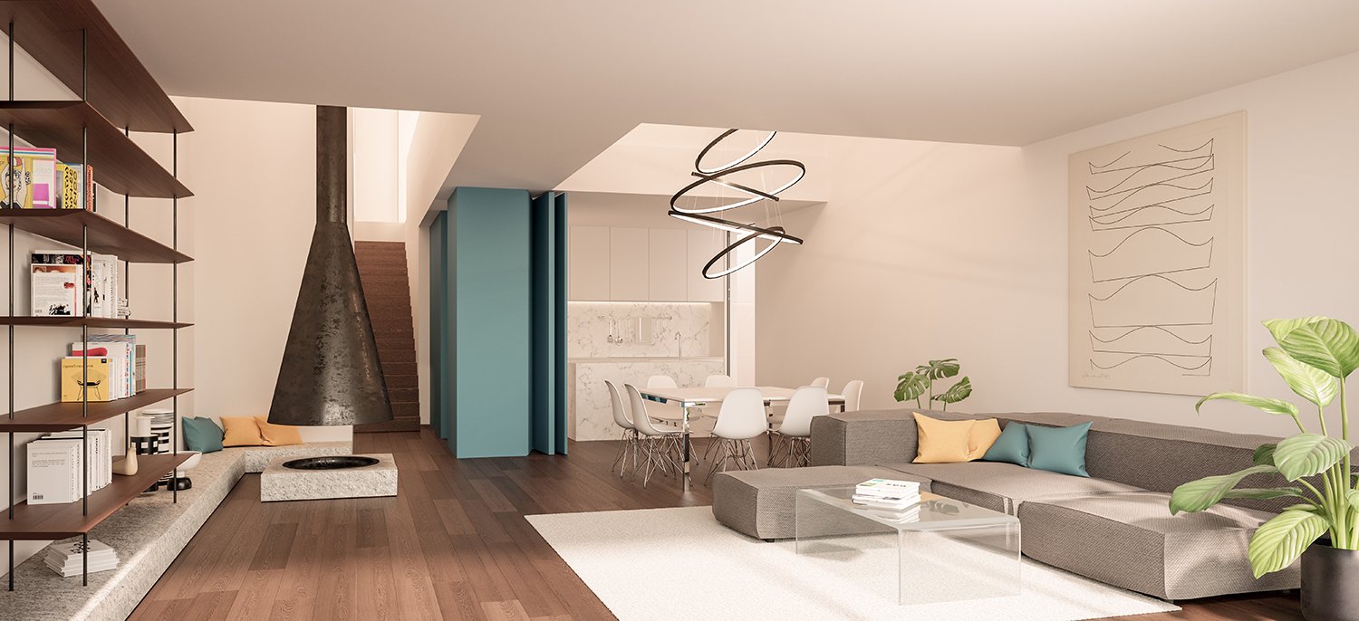 Tutte le unità condividono living ampi e fluidi, spesso caratterizzati da doppi volumi.