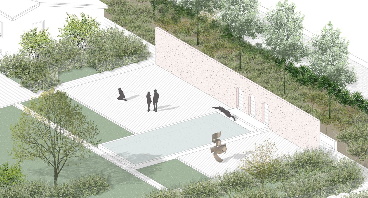 È prevista la realizzazione di una piscina come nuovo innesto nel contesto storico: la vasca, sollevata rispetto alla quota del prato, è incastonata in una piattaforma‑solarium. Sul retro, un muro con tre archi rivestiti di lastre in pietra naturale funge da fondale scenografico e crea uno spazio ideale per opere d’arte private. L’insieme richiama l’architettura borghese dei primi del Novecento in Italia, come Villa Necchi Campiglio o il vicino giardino della manifattura Fortuny.