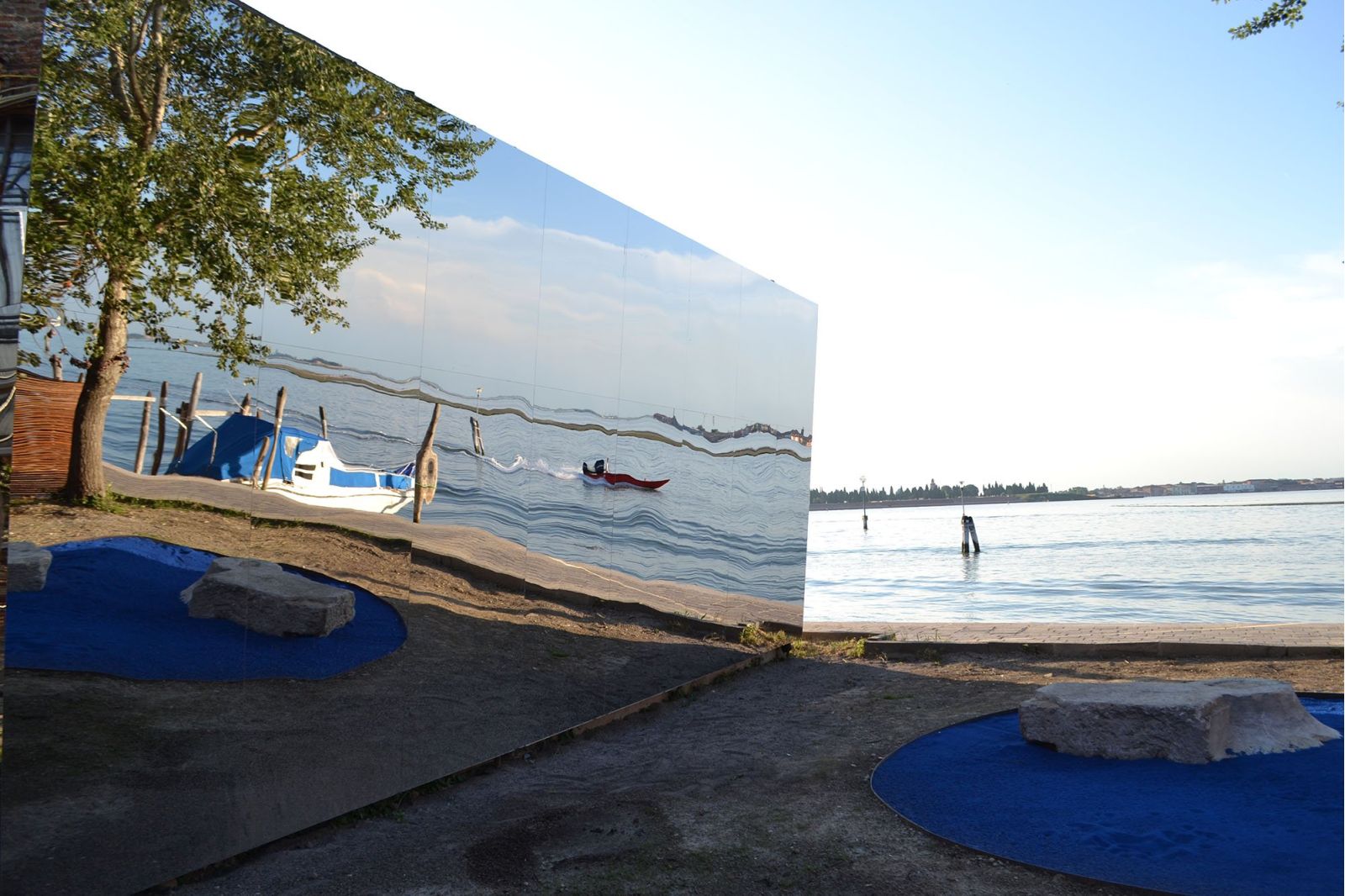 La combinazione dello specchio e del cerchio blu crea un punto d’osservazione contemplativo, capace di amplificare la relazione visiva e sensoriale con la Laguna di Venezia.